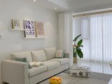 左手边黑色是厨房门,白色是入户门,入户鞋柜下面放鞋子 上面作为餐边柜,放一些小摆件还有净饮机,让喝水变得很方便。 沙发选的是米白色,沙发边放了旋转斗柜放小朋友的玩具。另一边放了8宫格实木柜,放玩具书本装饰品,容量很大 客厅墙面都是白色乳胶漆,顶面简单走了一圈石膏线,加上双层叠级吊顶,很显空间。地面是