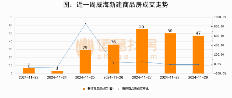 根据威海市住房和城乡建设局数据显示,2024年11月29日威海新建商品房成交47套,较昨日减少3套,环比下降6%