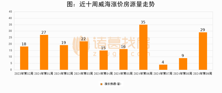 从调价房源来看,第8周威海涨价房源29套,较上周上涨222.2%。与此同时,8周涨价房源占比提升1.45个百分点,业主信心持续恢复。