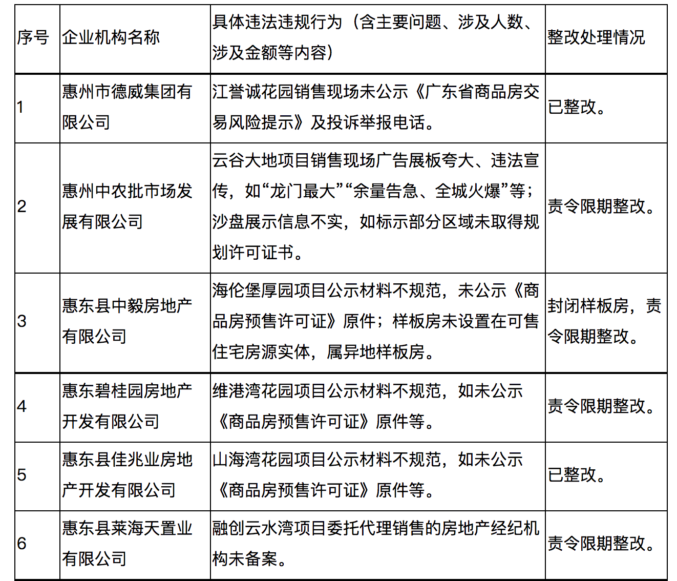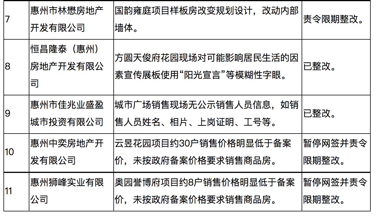 其中,惠州中奕房地产开发有限公司和惠州狮峰实业有限公司两家企业因销售价格明显低于备案价被暂停网签并责令限期整改。