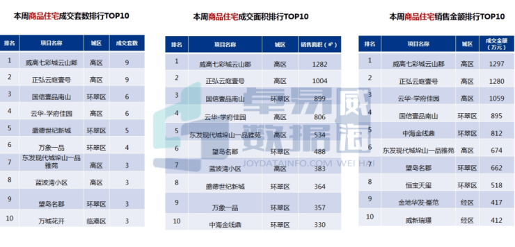 本周成交top10中,高区的威高七彩城云山郡和云庭壹号位列TOP1、2