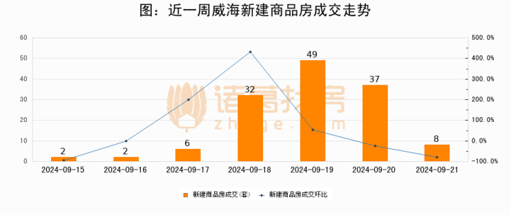 根据威海市住房和城乡建设局数据显示,2024年09月21日威海新建商品房成交8套,较昨日减少29套,环比下降78.4%
