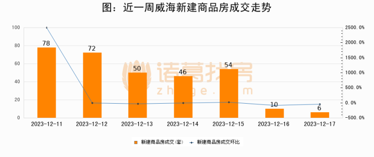 根据威海市住房和城乡建设局数据显示,2023年12月17日威海新建商品房成交6套,较昨日减少4套,环比下降40%
