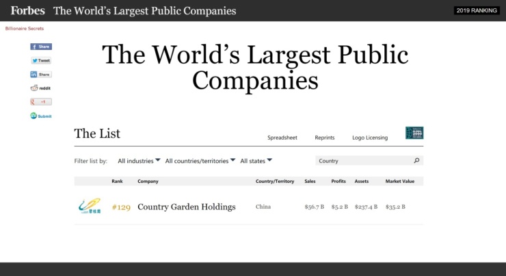 《福布斯》全球2000强公司发榜 碧桂园排名129位