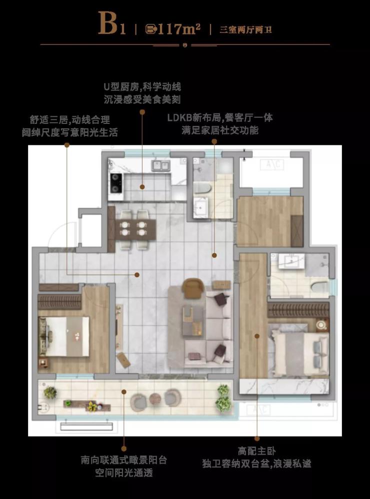 117平户型升级,将大出的20平,均分在各个空间,体感面积赶超市场130面积段户型,南向联通阳台高达约7.8米,超高得房率,主卧空间增至24平,双卫配置。