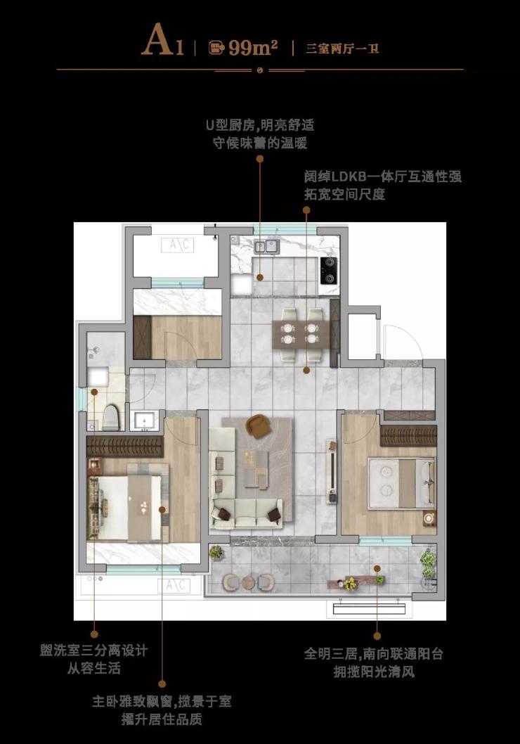 99平户型升级,南向整体面宽高达约10米,联通阳台约6.6米,外跨约1.6米,超大附加空间,三开间朝南,全明设计,约40平LDKB一体厅。