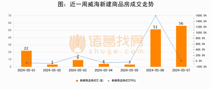 根据威海市住房和城乡建设局数据显示,2024年05月07日威海新建商品房成交56套,较昨日增加5套,环比上涨9.8%