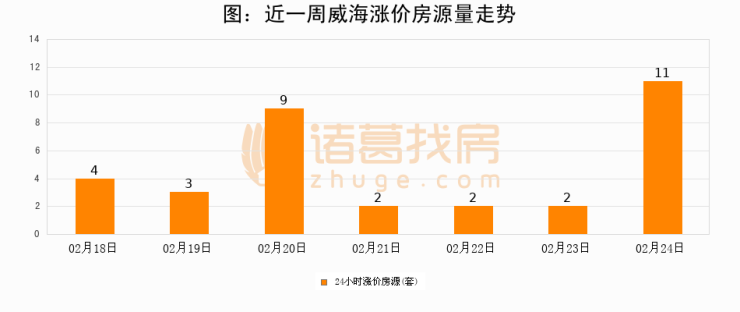 根据诸葛找房数据显示,威海24小时涨价房源量为11套,较02月23日增加9套,环比上涨450%。与此同时,涨价房源占比小幅扩大,业主信心有所提升。