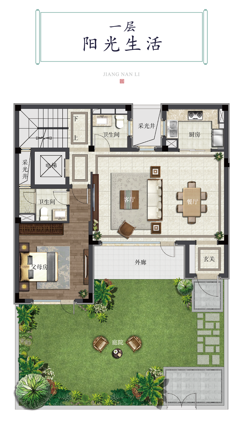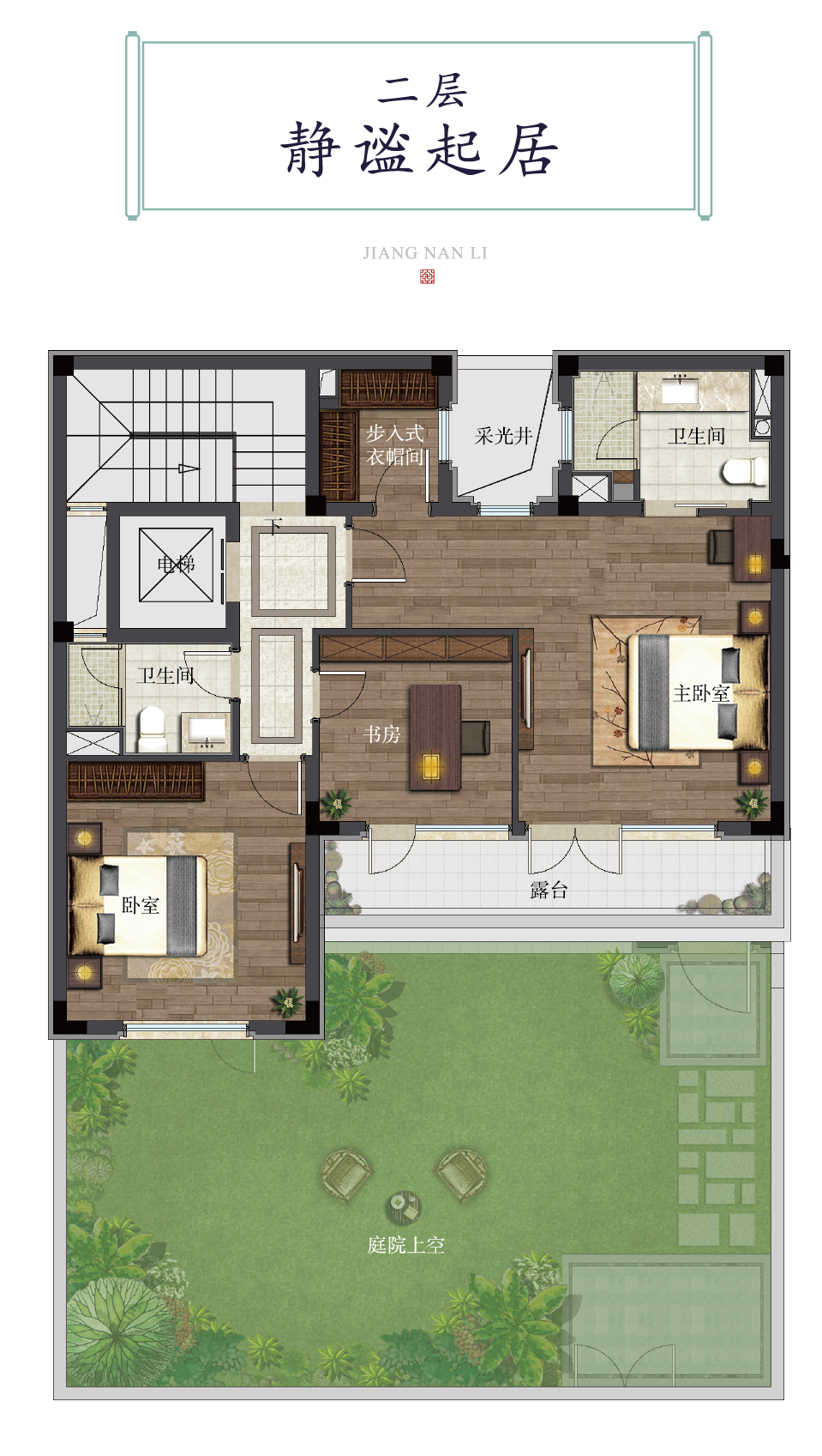 一层阔绰横厅,南向雅卧直面深院,赏天地开朗,纳四时风光。