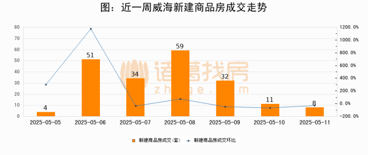 根据威海市住房和城乡建设局数据显示,2025年05月11日威海新建商品房成交8套,较昨日减少3套,环比下降27.3%。近一周威海新建商品房日均成交29套。05月11日单日成交8套,低于近一周平均水平72.4%。