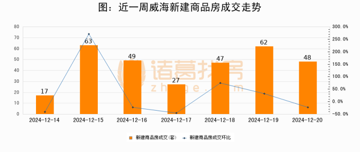 根据威海市住房和城乡建设局数据显示,2024年12月20日威海新建商品房成交48套,较昨日减少14套,环比下降22.6%