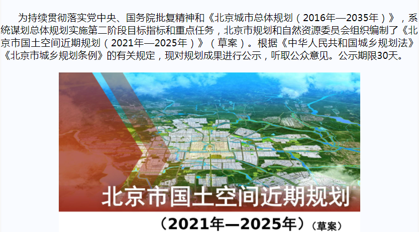 11月17日,北京市规划自然资源委组织公示了北京市国土空间近期规划草案,听取公众意见。公示期限30天。