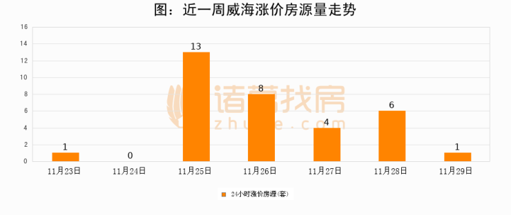 根据诸葛找房数据显示,威海24小时涨价房源量为1套,较11月28日减少5套,环比下降83.3%。与此同时,涨价房源占比小幅回落,对于购房者来说是一个入市窗口期,购房者可抓住时机入市。
