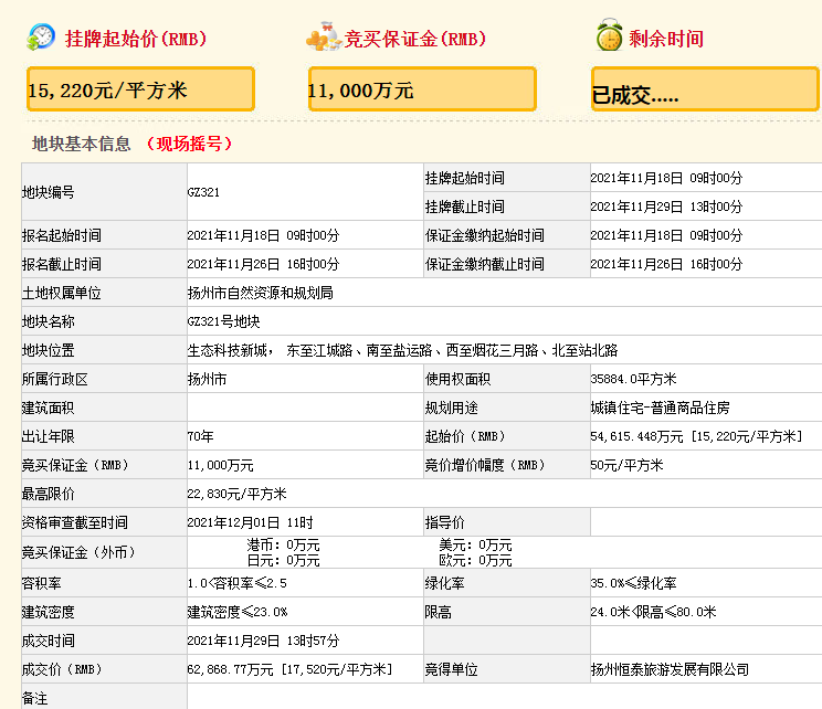 6、生态科技新城 GZ321地块(商住):被扬州恒泰旅游发展有限公司竞得,成交总价 62868.768万元, 楼面价约7008元/㎡。