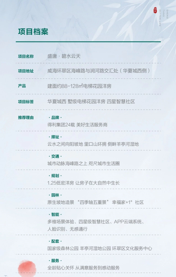 项目背靠里口山高级森林公园,拥有近万亩生态植被,是威海的“城市之肺”;南侧邻近羊亭河湿地公园,羊亭河支流蜿蜒流过项目地块前方,规划打造约7万㎡大型水系公园。项目离尘不离城,紧邻城市动脉海峰路和规划中的环山路,生活圈覆盖华夏城、韩乐坊商圈、万达商圈。