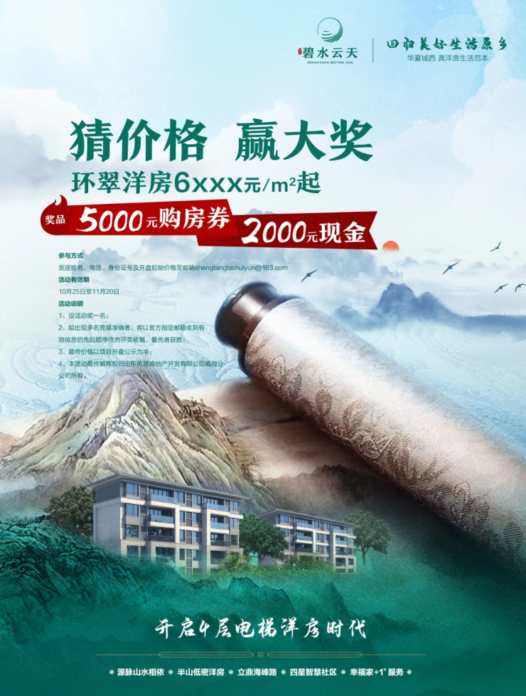 1、设活动奖一名;2、如出现多名竞猜准确者,将以官方指定邮箱收到有效信息的先后顺序作为评奖依据,较先者获胜;3、最终价格以项目开盘公示为准;4、本活动最终解释权归山东佑晟房地产开发有限公司威海分公司所有。
