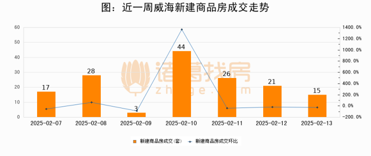 根据威海市住房和城乡建设局数据显示,2025年02月13日威海新建商品房成交15套,较昨日减少6套,环比下降28.6%。近一周威海新建商品房日均成交22套。02月13日单日成交15套,低于近一周平均水平31.8%。