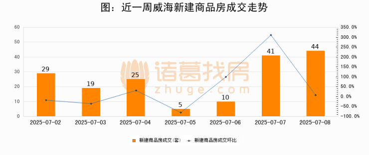 根据威海市住房和城乡建设局数据显示,2025年07月08日威海新建商品房成交44套,较昨日增加3套,环比上涨7.3%