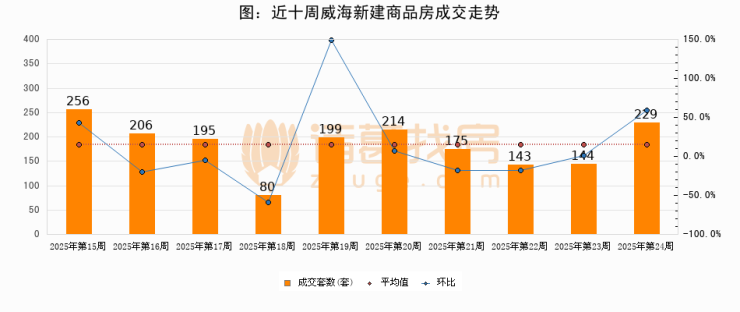 进入2025年第24周(06月09日-06月15日),威海新建商品房成交229套,较上周增加85套,环比上涨59%