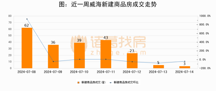 根据威海市住房和城乡建设局数据显示,2024年07月14日威海新建商品房成交3套,较昨日减少2套,环比下降40%