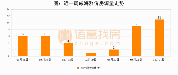 根据诸葛找房数据显示,威海24小时涨价房源量为11套,较03月31日增加2套,环比上涨22.2%。与此同时,涨价房源占比小幅扩大,业主信心有所提升。