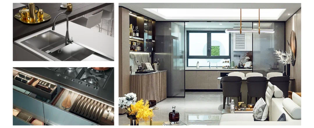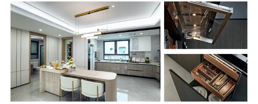 在厨房空间收纳方面,双餐具+全电器收纳系统,设置了超10人就餐的中西餐餐具收纳系统,更有调料、厨具、锅具专有收纳空间。专门设计了滑动式的电饭煲摆放空间,在下方还有抽屉,方便放置饭铲或者微波炉防烫手套等相关物品,使用十分方便。此外,中海·金线鼎在吸油烟机与灶台之间的墙面上安装了整面的toto赛乐板的项目,有效的解决了清洁问题。