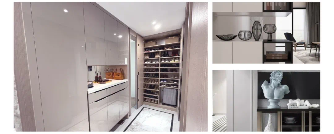 玄关柜上柜空间,可以存放女士的包。侧边柜挂衣区装有伸缩挂衣杆,用来收纳大衣、帽子、围巾等物品,可以容纳8个包包以及10件厚外套。玄关柜的门扇五金设置有阻尼,可以自行缓慢关闭,达到缓冲消音的效果。