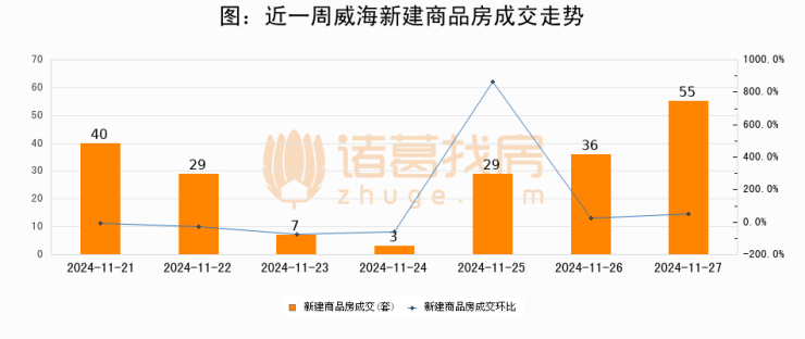 根据威海市住房和城乡建设局数据显示,2024年11月27日威海新建商品房成交55套,较昨日增加19套,环比上涨52.8%