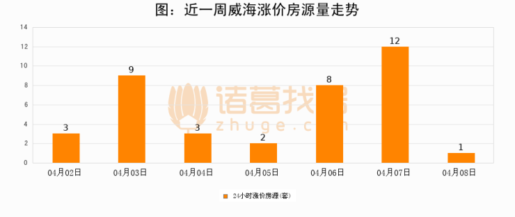根据诸葛找房数据显示,威海24小时涨价房源量为1套,较04月07日减少11套,环比下降91.7%。与此同时,涨价房源占比小幅回落,对于购房者来说是一个入市窗口期,购房者可抓住时机入市。