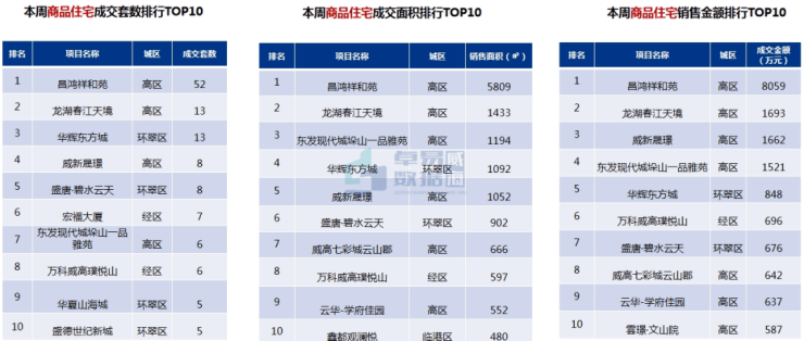 本周成交top10中,高区的昌鸿祥和苑和龙湖春江天境位列TOP1、2