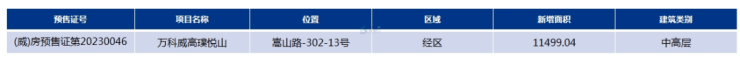 据卓易监测数据显示,本周经区的万科威高璞悦山新增1张预售证