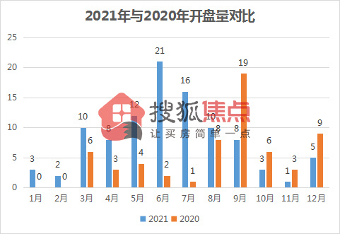 从2021年月份走势图来看,6月开盘/加推量较高,形成了推新小高潮,高峰期开盘/加推次数达21次,低峰期在11月仅1次开盘,其余月份表现平平,这不免受到市场大环境因素影响,开发商推盘节奏放缓,购房者也较为谨慎,但相较于去年,同比上涨约62%,2020年开盘/加推项目52个,共计开盘/加推61次,2020年开盘/加推量最多的月份在9月,共有19个项目开盘/加推。