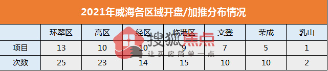 区域分布来看,主要集中在环翠区,开盘/加推共计25次,推盘数占2021年全年总量的24%,成为今年开盘主战场;高区以23次开盘/加推排名第二,经区以14次开盘/加推排名第三。