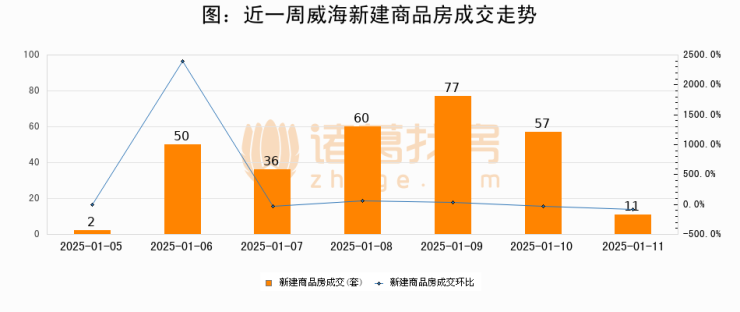根据威海市住房和城乡建设局数据显示,2025年01月11日威海新建商品房成交11套,较昨日减少46套,环比下降80.7%。近一周威海新建商品房日均成交42套。01月11日单日成交11套,低于近一周平均水平73.8%。