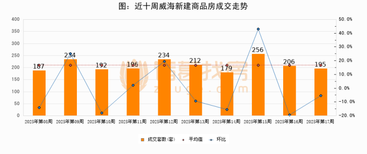 进入2025年第17周(04月21日-04月27日),威海新建商品房成交195套,较上周减少11套,环比下降5.3%