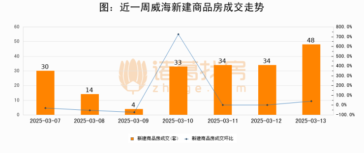 根据威海市住房和城乡建设局数据显示,2025年03月13日威海新建商品房成交48套,较昨日增加14套,环比上涨41.2%