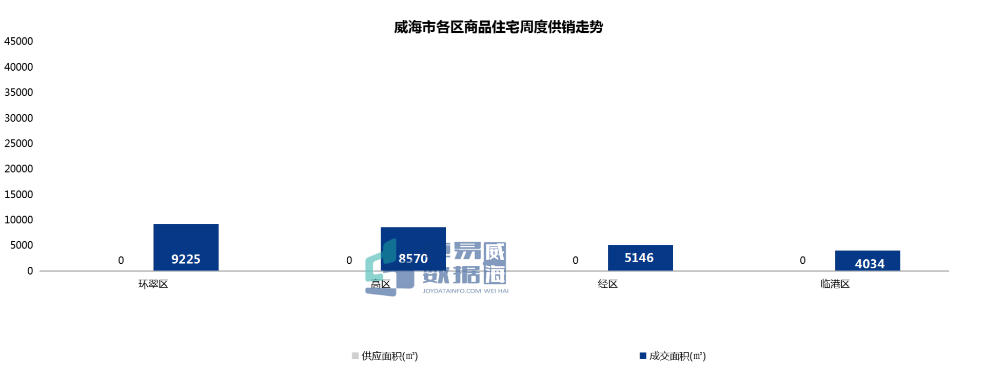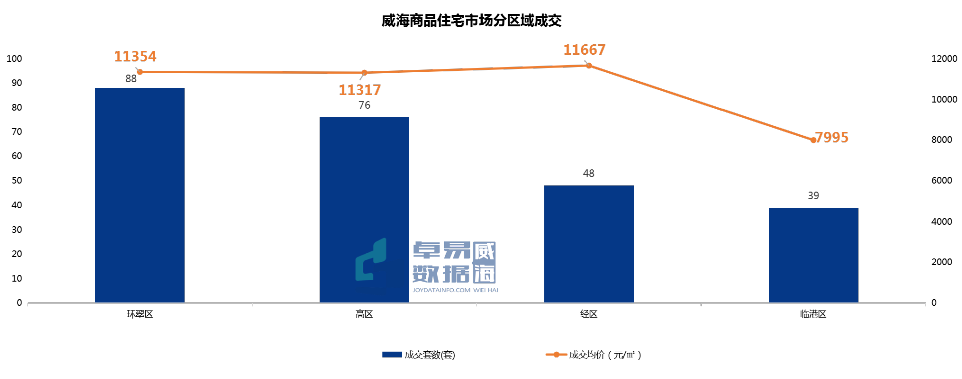 本周威海商品住宅成交面积和成交套数以环翠区最多,成交88套,成交面积9225㎡;成交均价以经区较高,均价11667元/平。