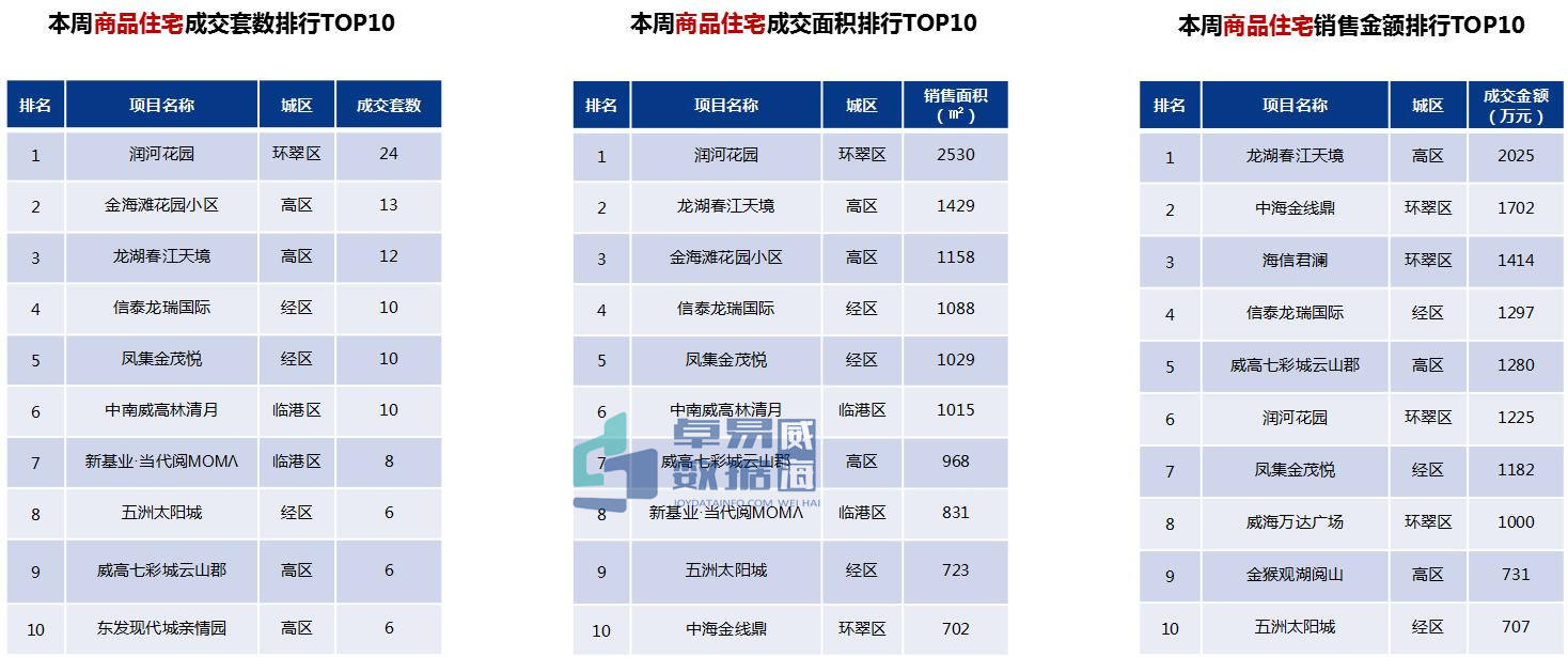 本周成交TOP10各区分散成交,环翠区润河花园项目本周集中网签,在成交套数、成交面积排行榜上均位于排名前列。高区龙湖春江天境项目本周成绩不俗,在成交套数、成交面积、销售金额榜上均跻身三甲。