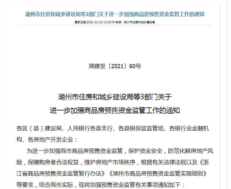 12月22日,为进一步加强湖州市商品房预售资金监管,保护资金安全,防范化解房地产风险,保障购房者合法权益,维护房地产市场秩序。湖州市住房和城乡建设局等3部门发布关于进一步加强商品房预售资金监管工作的通知。