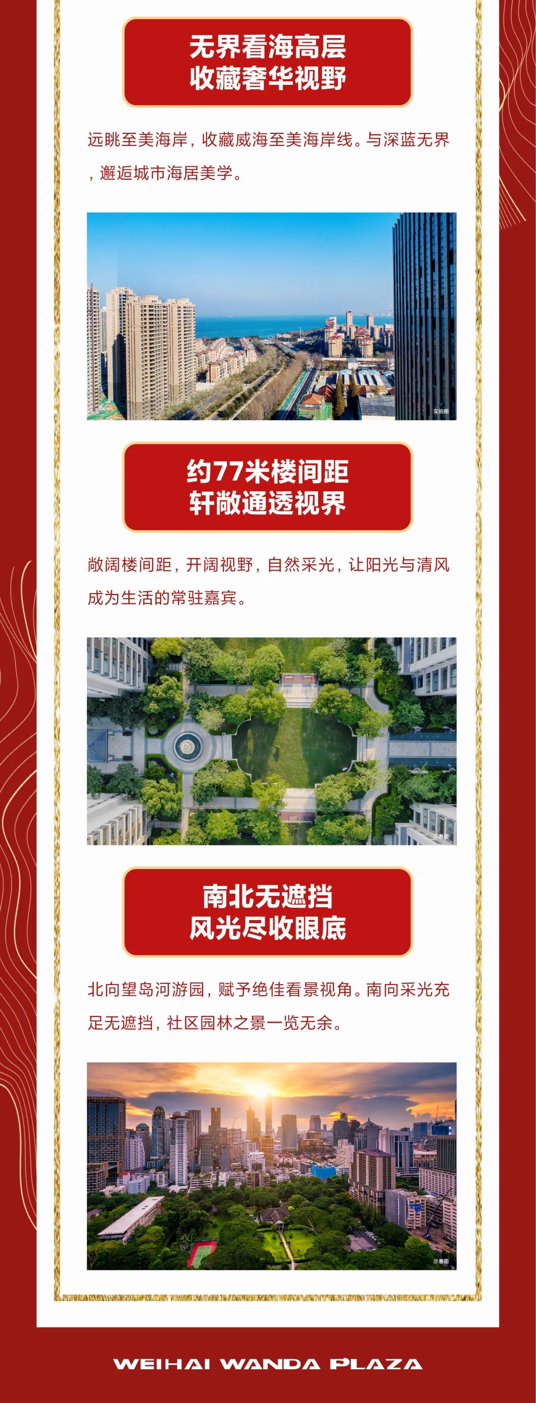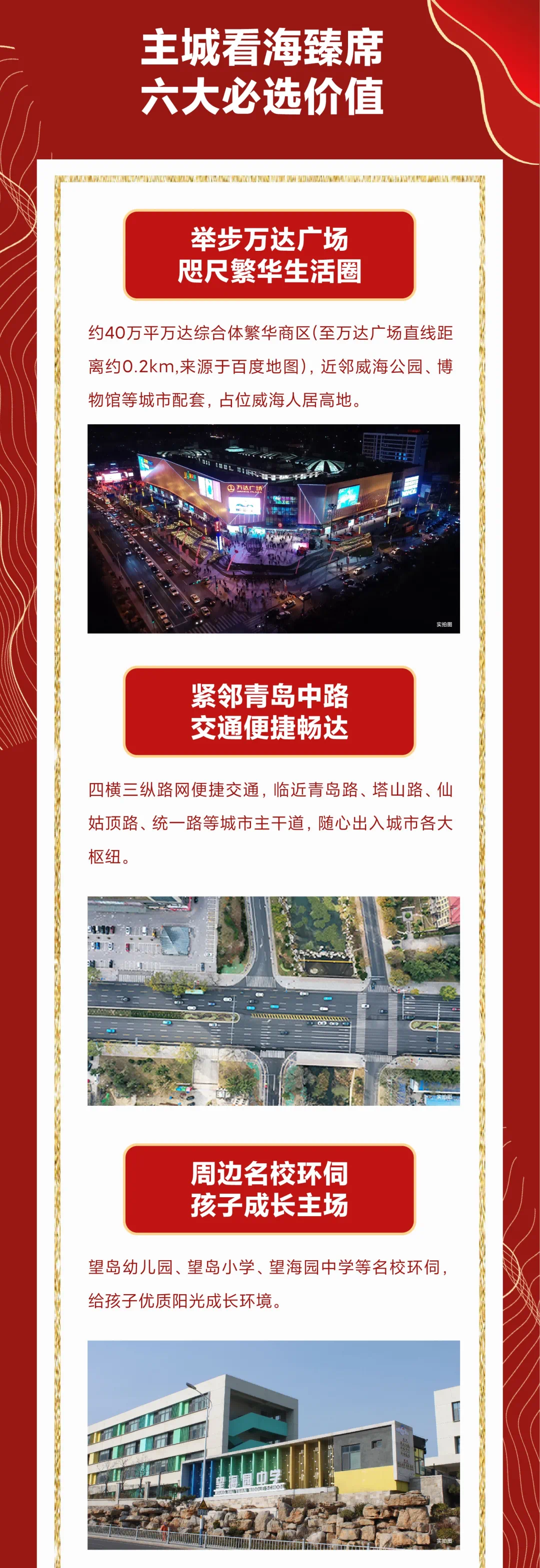 威海万达广场 【新春置业N重福利 助力安家主城芯】 万达新春纳福购房节 1#清盘钜惠注册好房推荐官送免费停车券关注万达星球送爆米花等福利即将来袭,敬请期待~ VIP-LINE:400-156-0036 转 395482 【免责声明】1.本资料中对项目或产品的介绍,旨在提供相关信息,不作为购房承诺;买