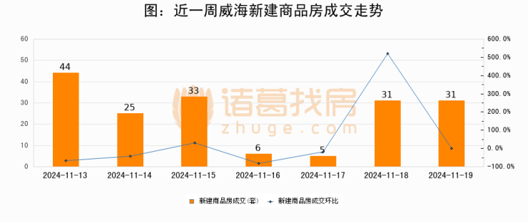 根据威海市住房和城乡建设局数据显示,2024年11月19日威海新建商品房成交31套,较昨日持平