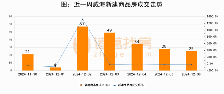 根据威海市住房和城乡建设局数据显示,2024年12月06日威海新建商品房成交25套,较昨日减少3套,环比下降10.7%