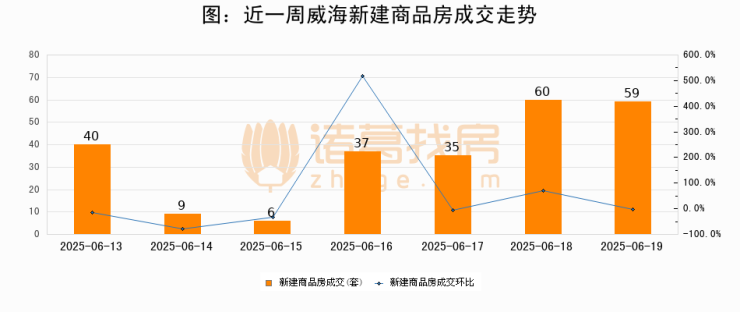 根据威海市住房和城乡建设局数据显示,2025年06月19日威海新建商品房成交59套,较昨日减少1套,环比下降1.7%