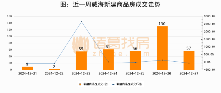 根据威海市住房和城乡建设局数据显示,2024年12月27日威海新建商品房成交57套,较昨日减少73套,环比下降56.1%