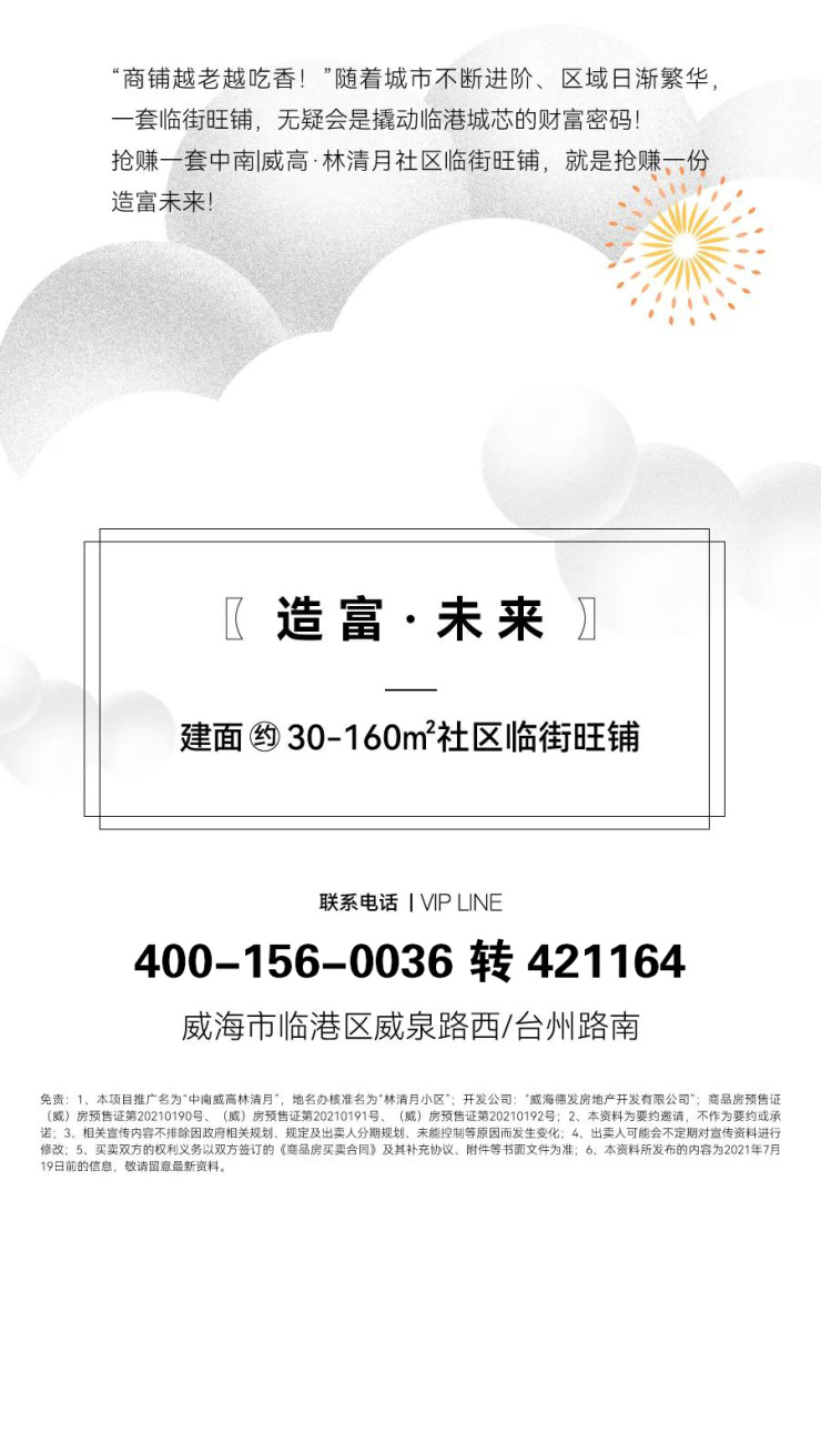 免责声明:本项目推广名为“中南威高林清月”,地名办核准名为“林清月小区”;开发公司为:“威海市德发房地产开发有限公司”;商品房预售证:“(威)房预售证第20190123-20190127号”;本公众平台致力分享有价值的内容,转载引用仅为传播更多信息之目的,部分图片、文字、音乐等内容源自网络,版权归原作者所有,本文只作为引用,如涉及侵权请联系我们删除,谢谢;本公众平台所刊载的楼盘广告、产品图片、广告文字、活动链接等仅为要约邀请,买卖双方的权利义务以最终签署的商品房买卖合同为准,文章所涉及的销售信息最终以中南置地青岛区域公司较新公布为准;本广告相关面积段均为建筑面积,最终计算面积以房管局测绘面积为准。相关宣传内容不排除因政府相关规划、规定及出卖人分期规划、未能控制等原因而发生变化;买卖双方的权利义务以双方签订的《商品房买卖合同》及其补充协议、附件等书面文件为准;出卖人可能会不定期对宣传材料进行修改;本资料所发布的内容为2021年7月25日前的信息,敬请留意较新资料,所有图片仅为示意,规划均以政府批示为准,不构成本公司对广告相应内容的承诺,开发商拥有进一步补充和解释的权利。