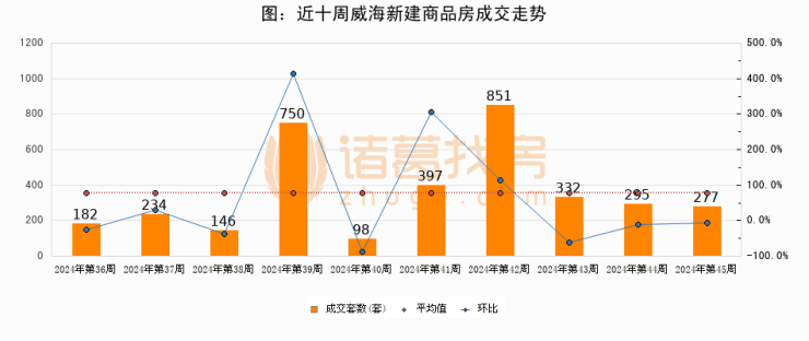 进入2024年第45周(11月04日-11月10日),威海新建商品房成交277套,较上周减少18套,环比下降6.1%