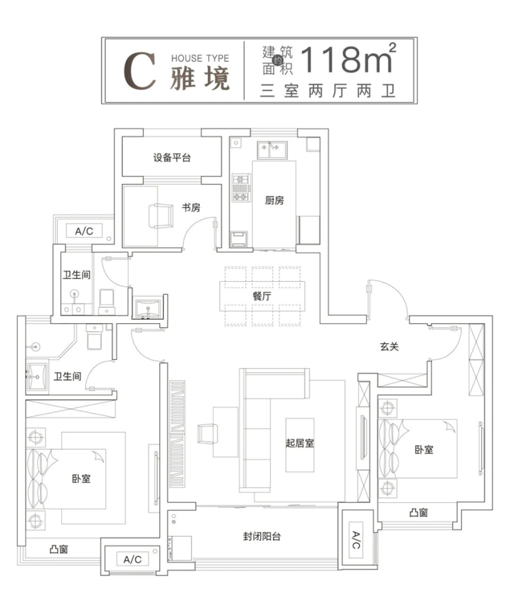 建面约118㎡轩阔三居,产品设计融入了对城市家庭的调研与洞察,将产品的舒适尺度、生活私密、功能完备、健康关怀等态度深植其中,探寻当代城市人群所向往的居住哲学。