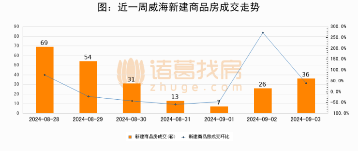 根据威海市住房和城乡建设局数据显示,2024年09月03日威海新建商品房成交36套,较昨日增加10套,环比上涨38.5%