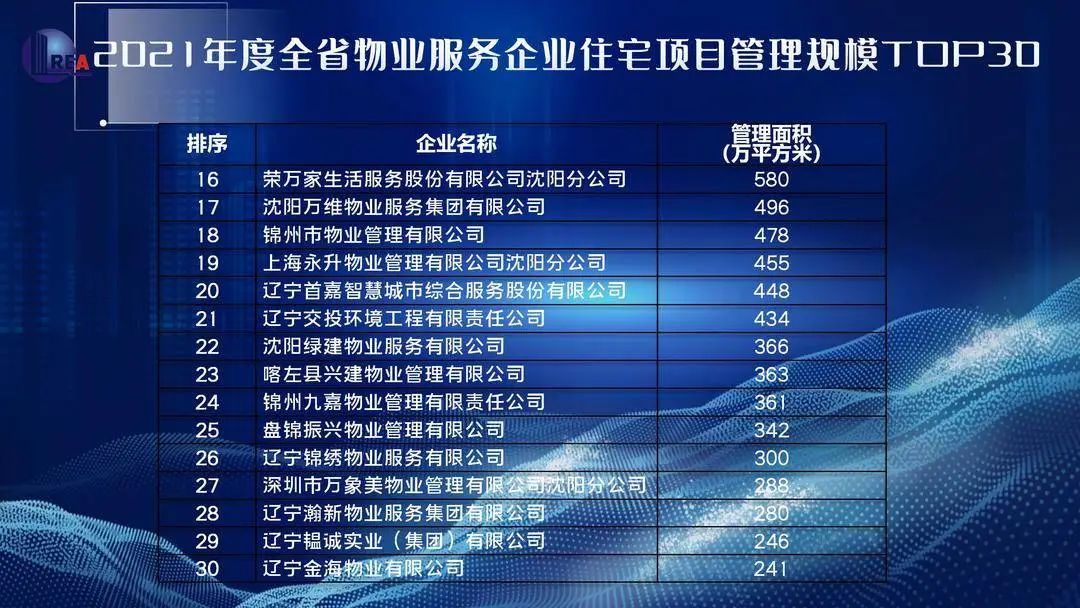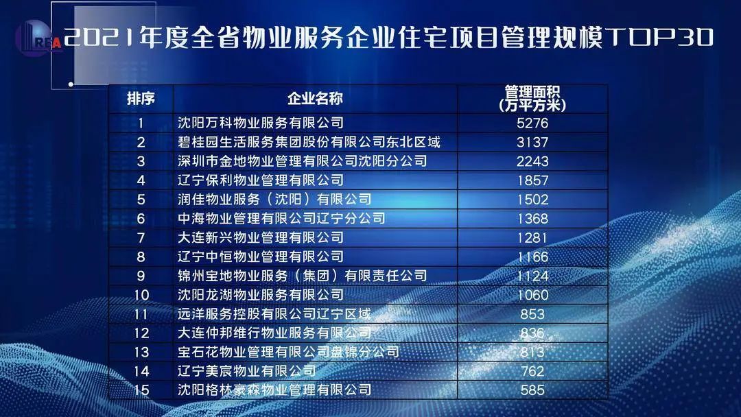 在2021年度辽宁省商品住宅销售面积TOP50品牌中,碧桂园、万科、华润排在前三位,成交面积数据分别是108.22万、103.60万、71.87万平方米。在2021年度全省物业服务企业住宅项目管理规模TOP30中,沈阳万科物业服务有限公司、碧桂园生活服务集团股份有限公司东北区域、深圳市金地物业管理有限公司沈阳分公司分别以5276万平方米、3137万平方米、2243万平方米的管理面积排名前三。