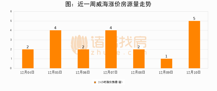 根据诸葛找房数据显示,威海24小时涨价房源量为5套,较12月09日增加4套,环比上涨400%。与此同时,涨价房源占比小幅扩大,业主信心有所提升。